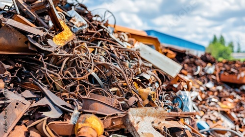 A vast, weathered heap of rusted industrial scrap metal and debris under a bright midday sun