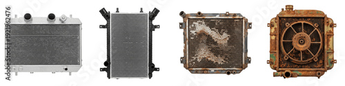 Automotive Radiator and Cooling System Collection, Vehicle Heat Exchanger and Condenser Set, Aluminum and Copper Core Engine Cooling Hardware, Isolated PNG