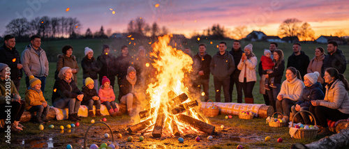Panoramic view of a large group of families and friends gathered around a glowing traditional Easter bonfire at sunset, with colorful eggs in baskets celebrating spring holiday traditions.