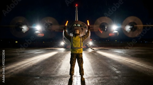 Back View of Military Ground Crew Marshalling Transport Aircraft at Night in Rain