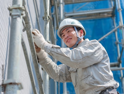 建設現場の足場で作業をしながら明るい笑顔を見せるヘルメット姿の日本人男性作業員