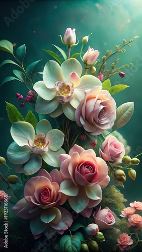 A majestic arrangement of fresh roses and orchids fills a lush green background in full bloom