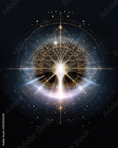 A celestial Tree of Life resplendently radiates cosmic energy, symbolizing connection and unity, surrounded by ethereal light patterns in a vibrant cosmic space.