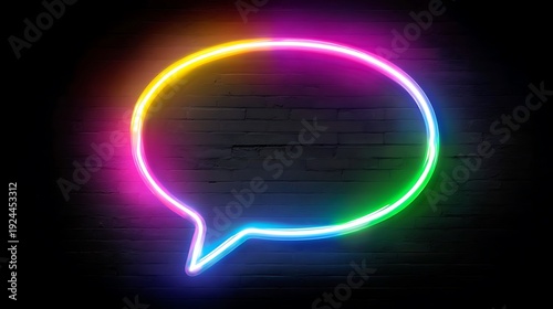 Radiant rainbow-colored neon speech bubble illuminating a stark black background.