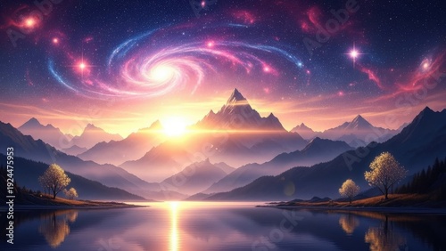 Stunning cosmic twilight with spiral galaxy, mountain range, and serene lake reflecting vibrant celestial colors