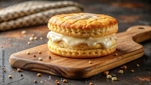 A photo of a classic sandwich biscuit with a creamy cheese filling and a drizzle of sweet glaze, sitting on a wooden cutting board The biscuit is gol