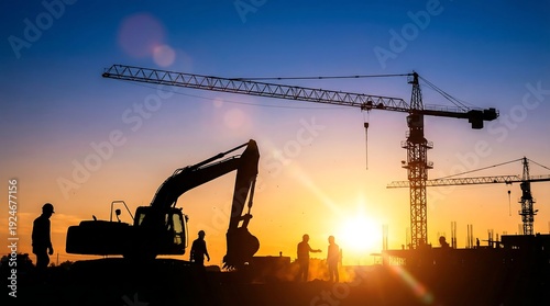 Silhouettes of construction workers and heavy machinery, including cranes and excavators, against a dramatic sunset.