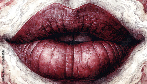 Close-up hyper-realistic dark purple lips with glossy texture on vintage lace background beauty makeup