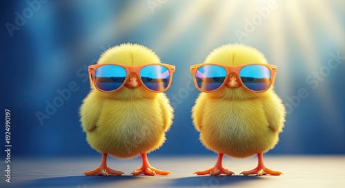 Easter sunday fun with cool chicks wearing sunglasses on a sunny day
