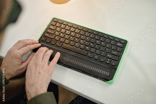 Caucasian middle aged man using braille display keyboard with both hands on desk in library setting, demonstrating assistive technology for blind individuals accessing information