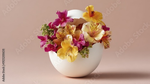 Floral arrangement in cracked eggshell on soft pink background