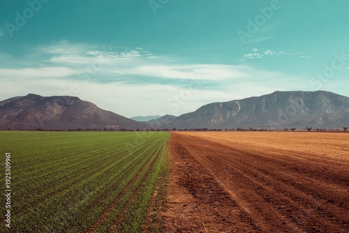 Contrasting fields of green crops and plowed earth against majestic mountains