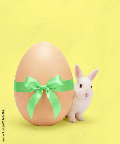 Motyw wielkanocny - mały, biały królik stojący obok jajka przewiązanego zieloną wstążką, na bjasnym, żółtym tle