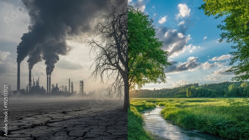 Industrial Pollution vs. Pristine Nature Split Scene with Cracked Earth and Lush Green Landscape