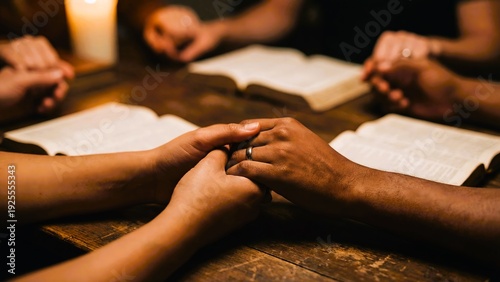 Diverse Group Holding Hands in Prayer Over Open Bibles Representing Christian Fellowship Worship Spiritual Community and Faith Gathering