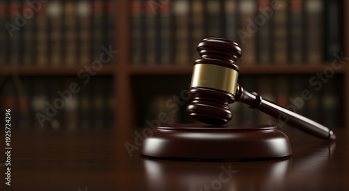 Justice symbol wooden gavel resting on sounding block with bookshelf background