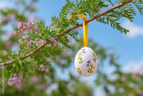 A hollowed-out eggshell hangs from a tree branch decorated with flowers