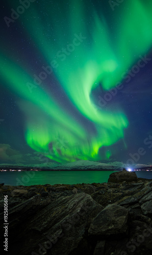 l'aurora boreale si mostra sul mare, vista dalla città di tromso