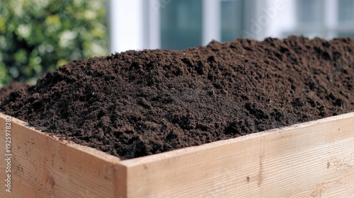 Raised wooden garden bed filled with rich dark soil. Close-up of fertile compost ready for planting outdoors. Gardening, agriculture, cultivation and organic growth concept