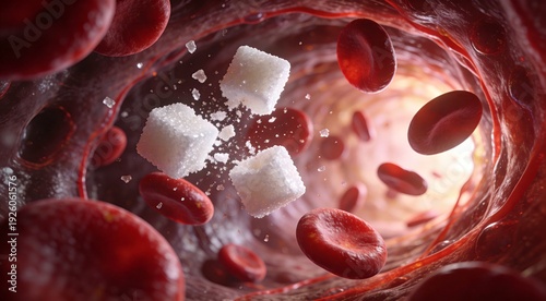 Glucose crystals and erythrocytes, circulating in arterial vessel, microscopic view, internal anatomy, medical science