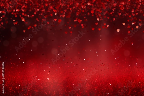 Red shimmering glitter and falling heart shapes creating an abstract bokeh background