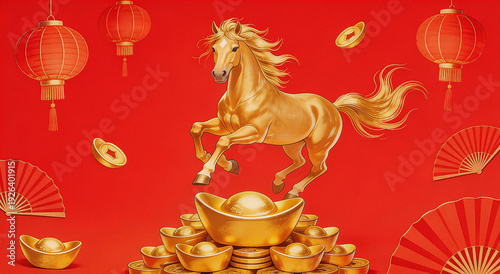 Golden Horse with Chinese New Year Symbols and Gold Coins