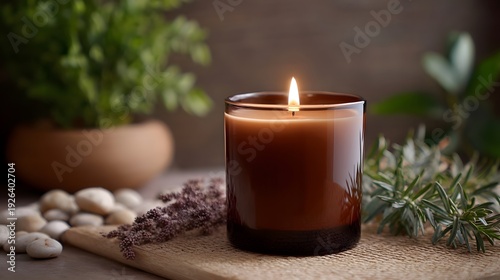 A lit scented candle in a brown glass jar rests on a textured surface with natural elements for a calming spa atmosphere