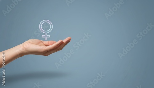 female symbol, woman day, empowerment, feminism, gender equality, womanhood, female rights icon over hand for International Women's Day, healthcare and social advocacy.