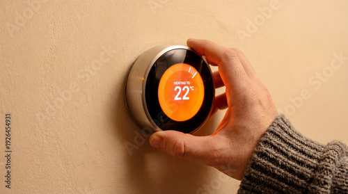 Hand adjusting modern smart thermostat to set heating temperature to 22 degrees Celsius