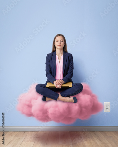 Kobieta z zamkniętymi oczyma medytuje z laptopem na kolanach siedząc na różowej chmurze w biurze