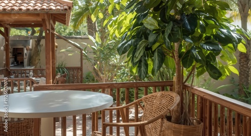 Vacation rental study nook with white table, beech chair, lush ficus and outdoor gazebo structure