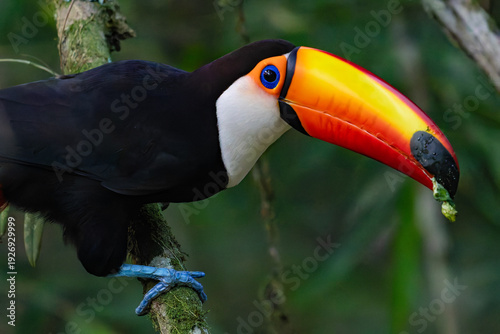 Toco Toucan perched on a branch in Iguazu. Vibrant tropical bird with a large orange beak in the rainforest of Misiones, Argentina.