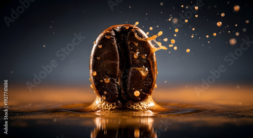Close up makro sebuah biji kopi panggang memercik ke dalam cairan dengan tetesan keemasan