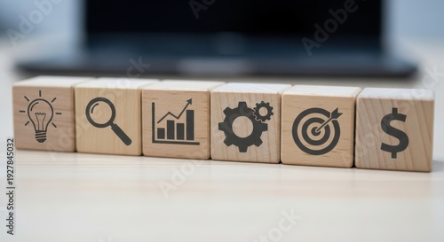 Wooden cubes featuring business planning icons aligned manually with crisp focus and subtle blurred desk surface.