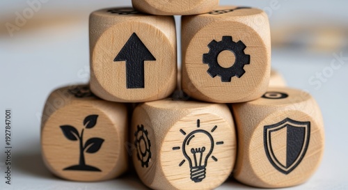 Wooden cubes featuring strategic improvement icons arranged manually with shallow focus and simple gently blurred surroundings.