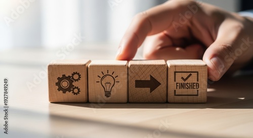 Wooden cubes representing workflow systems positioned manually with fine macro detail and diffused background blur.
