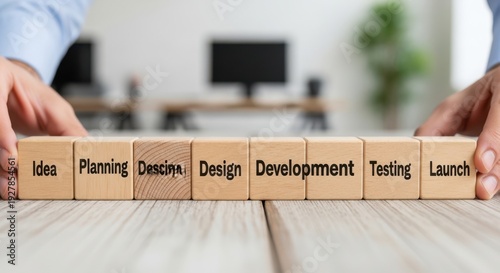 Wooden cubes showing workflow stages being aligned manually using crisp foreground focus and smooth blurred background.
