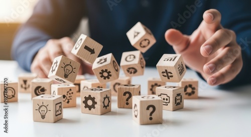 Creative problem solving and scattering the cubes randomly using wooden cubes, symbolic icons, human hand, natural depth of field, soft blurred background, clean white desk.