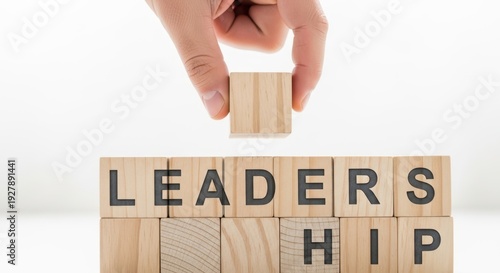 Leadership wooden cubes positioned manually with sharp foreground focus and softly diffused white background.