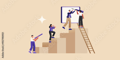 People climbing stairs and looking through telescopes at a framed canvas