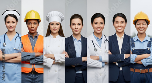 International womens day professional women workforce portrait collage showing nurse engineer chef doctor manager and technician unity empowerment concept
