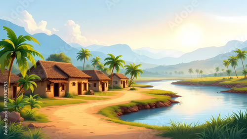 Cartoon Background Peaceful tropical village at golden hour, nestled by a tranquil river with distant misty mountains and lush palm trees. Digital art, village, tropical, river, mountains, sunset, gol