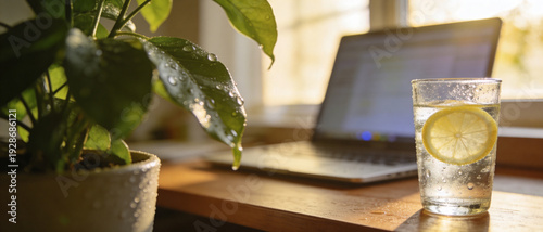 Refreshing Workspace Hydration Concept with a Glass of Lemon Water, Potted Green Plant with Dew Drops, and a Laptop on a Wooden Desk Bathed in Warm Golden Hour Sunlight for Wellness and Focus.