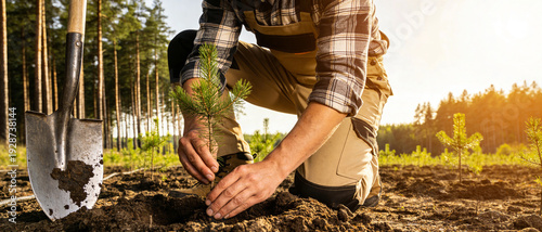 Close-up of a Man Planting a Small Pine Tree Sapling in a Field During a Reforestation Project at Golden Hour. Environmental Conservation Effort to Restore Forest Ecosystem and Sustainability.