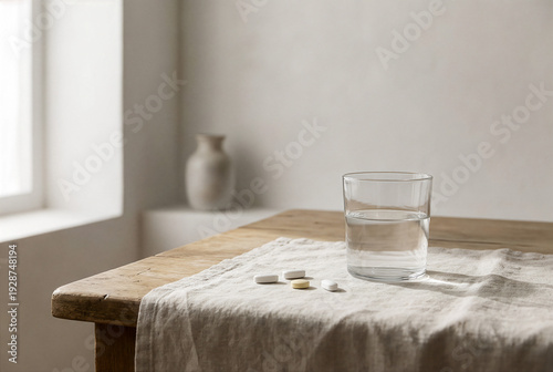 木製テーブルの上に並ぶ錠剤と水のグラスのミニマルな医薬品コンセプト
