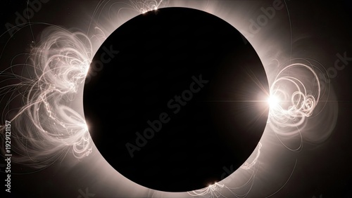 Total solar eclipse, moon blocking sun, ethereal glowing corona, celestial event, dramatic space background, cosmic phenomenon, astronomical wonder