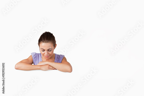 Woman leaning forward, arms on white ledge in studio in lilac top, looking down, copy space