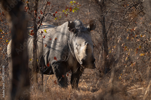 White rhinoceros standing in the bush. Ceratotherium simum is the largest extant species of rhinoceros and the most social of all rhino species