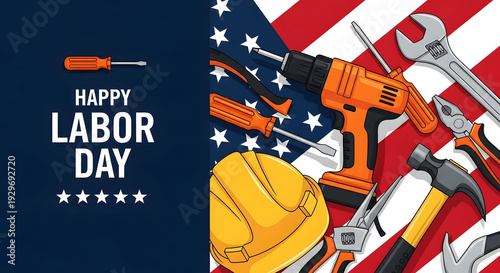 Happy labor day celebration with american flag and workers tools