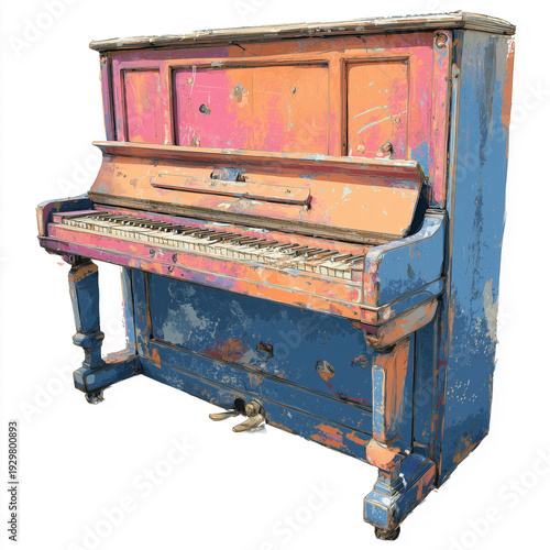Stare, zniszczone pianino z łuszczącą się farbą w odcieniach niebieskiego i różu. Wyrazisty symbol czasu, który utracił blask, lecz zyskał duszę.